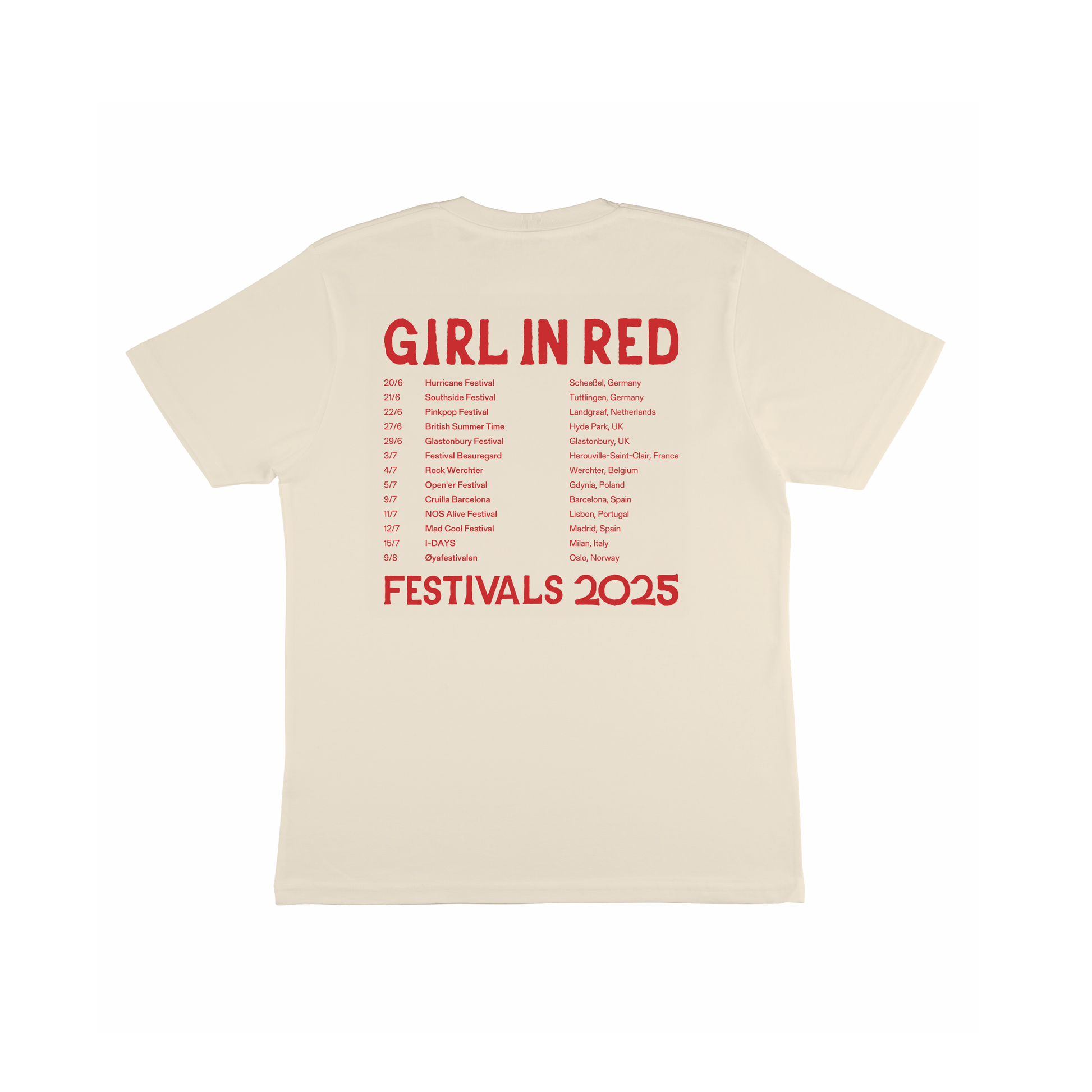 Relaxed fit crew neck natural tee in combed cotton, featuring GIRL KISSER printed on the front and UK/Europe festival dates on the back.